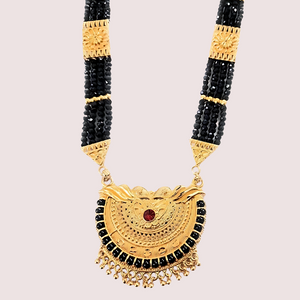 The Traditional Gold Plated Pahadi Mangalsutra is a classic piece of jewelry that reflects the rich heritage of the Pahadi region. Made with gold plating, this Mangalsutra features traditional design elements, making it ideal for weddings and special occasions. Its elegant and timeless style adds a touch of cultural charm to your look. This Mangalsutra is perfect for those who want to embrace traditional beauty while enjoying the sophistication of gold-plated jewelry.